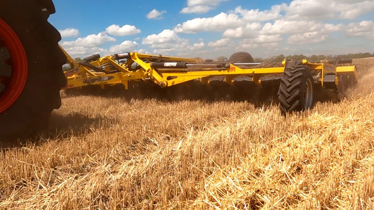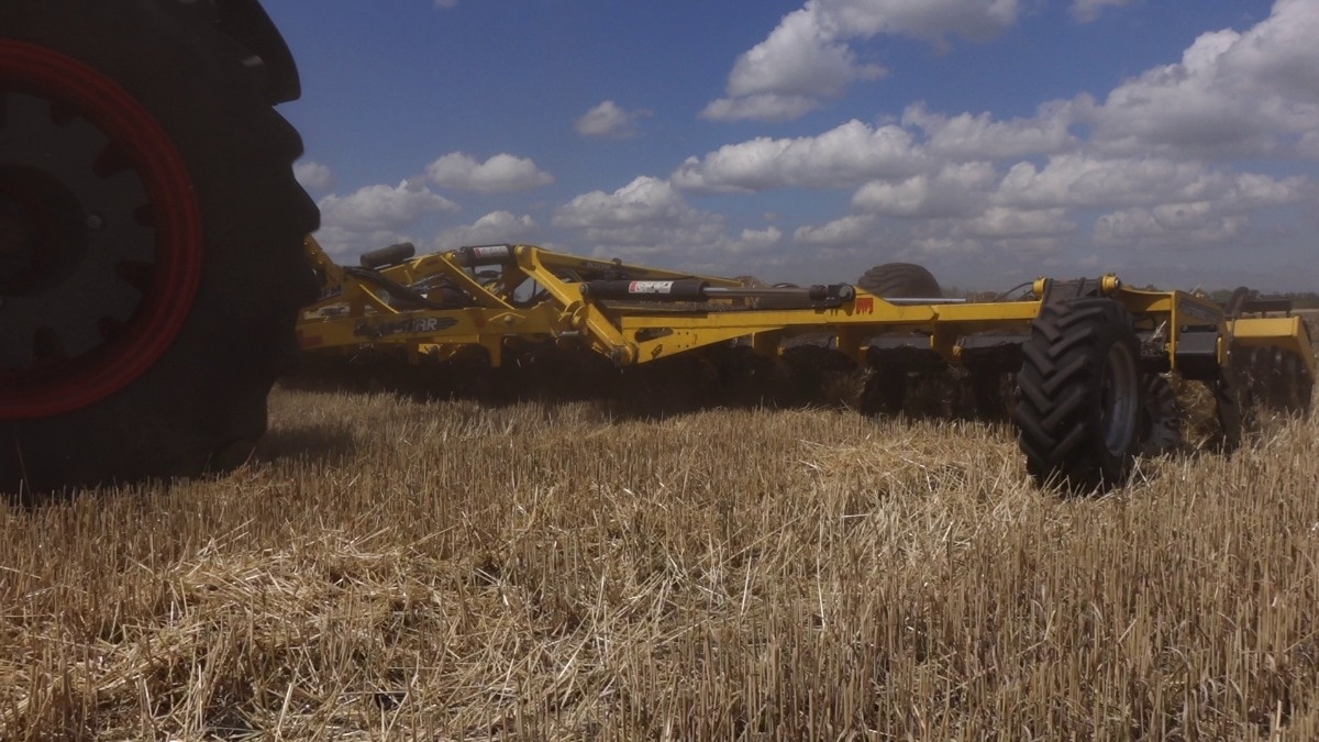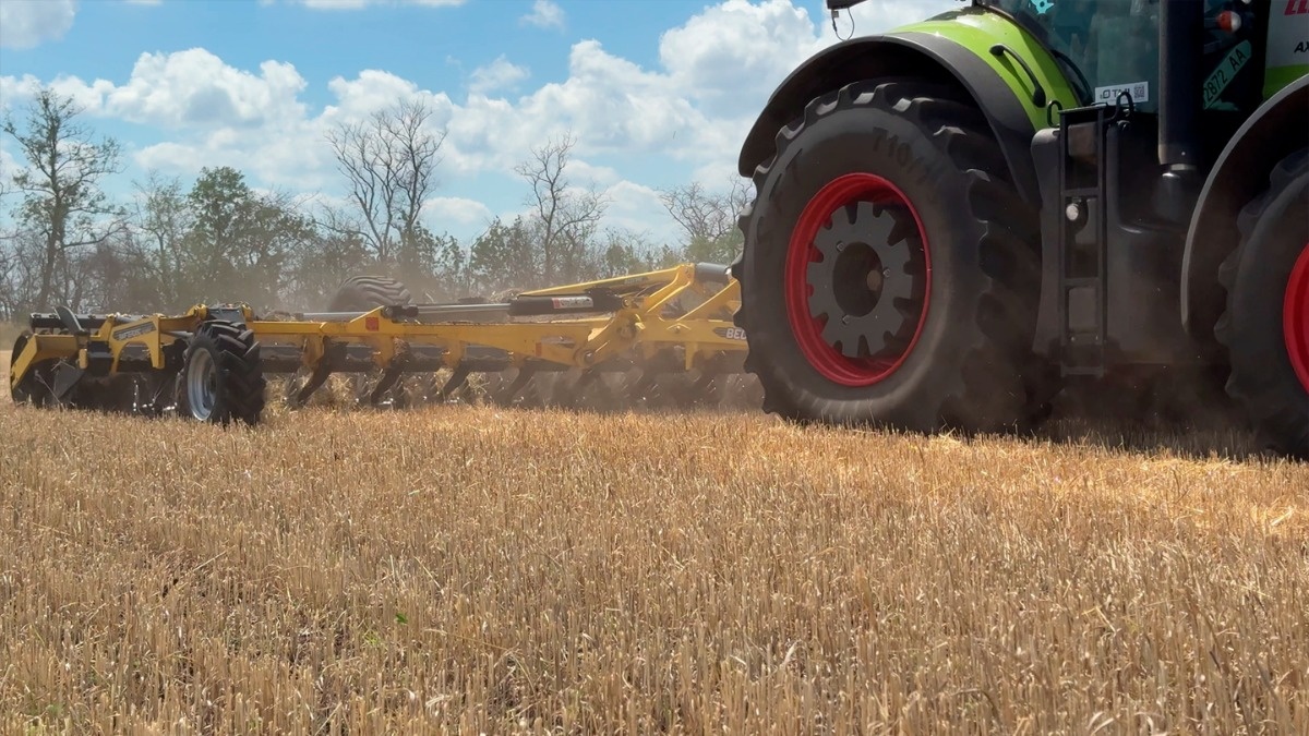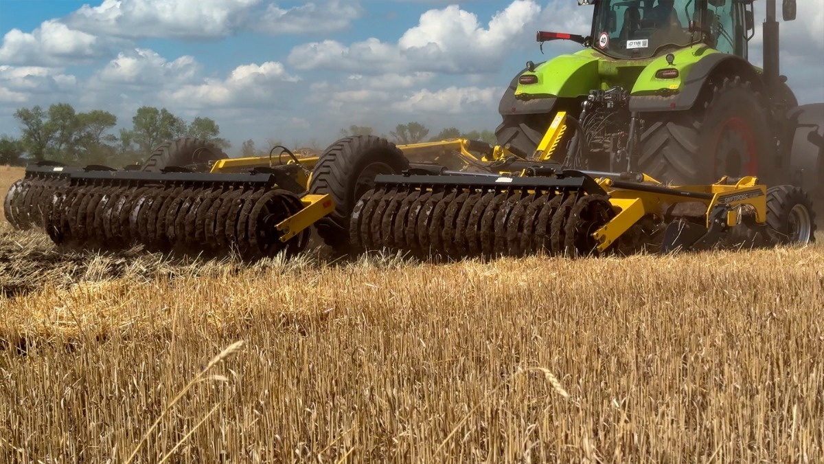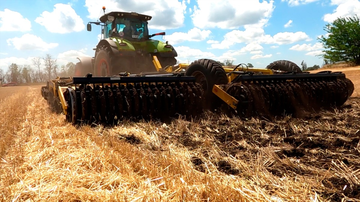 Агроном розповідає, що обробіток ґрунту після збирання зернових в господарстві проводять дискатором SWIFTERDISC XO 8000F від BEDNAR, який агрегатується із трактором Claas Axion 930.