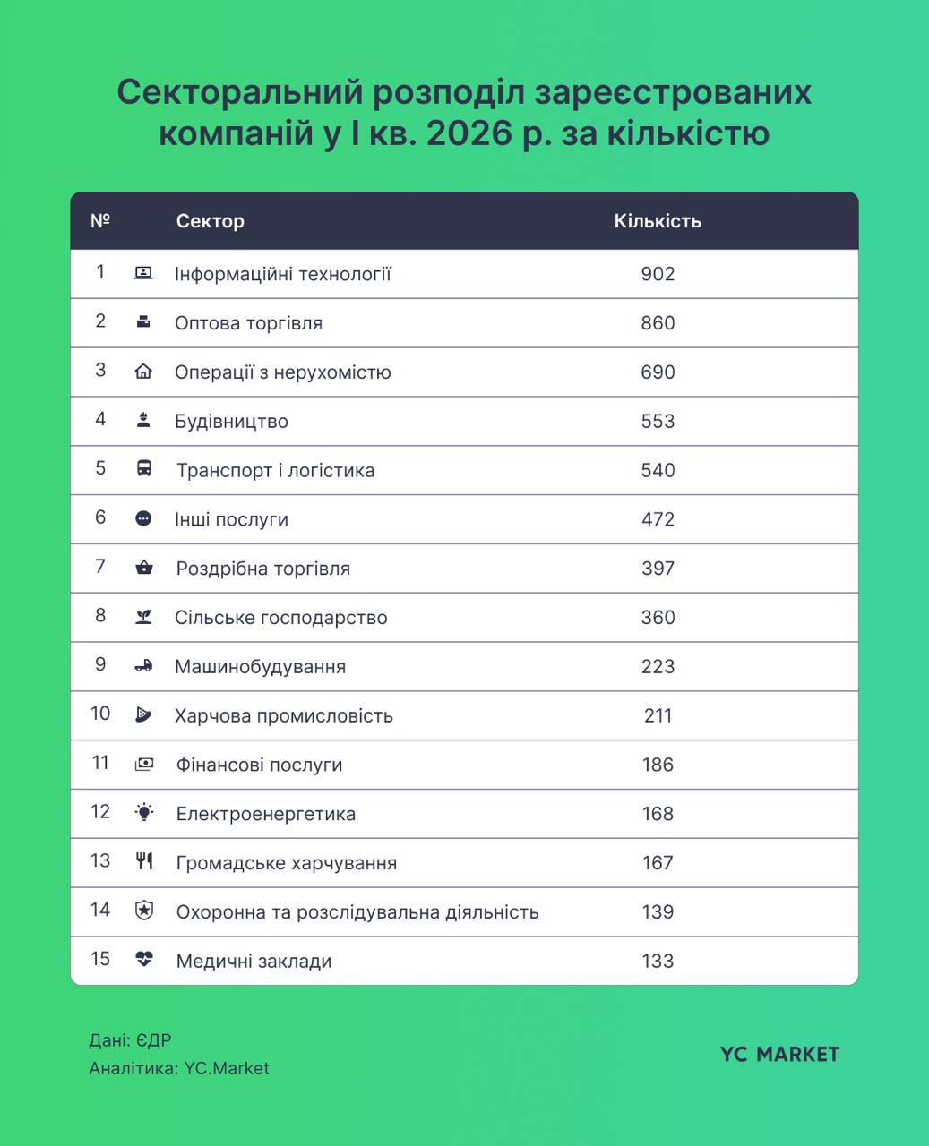 Загалом структура нових реєстрацій показує зміщення бізнес-активності в бік послуг, ІТ та фінансового сектору, тоді як традиційні галузі, включно з агро, демонструють слабшу динаміку або спад.